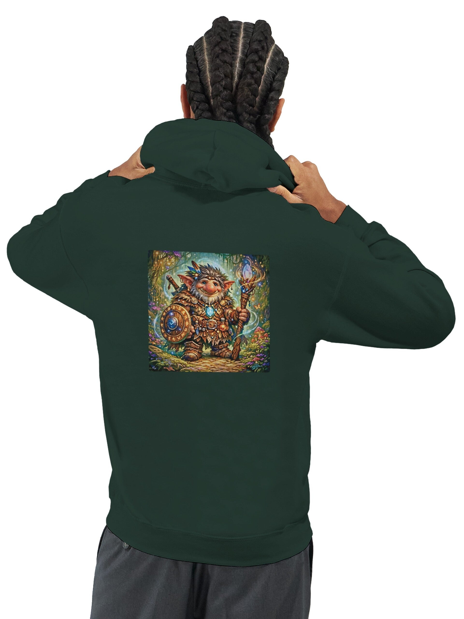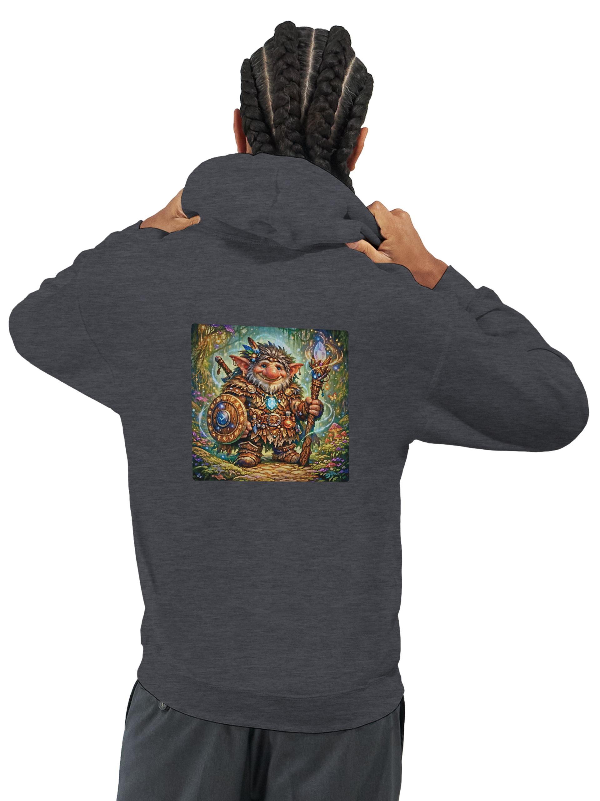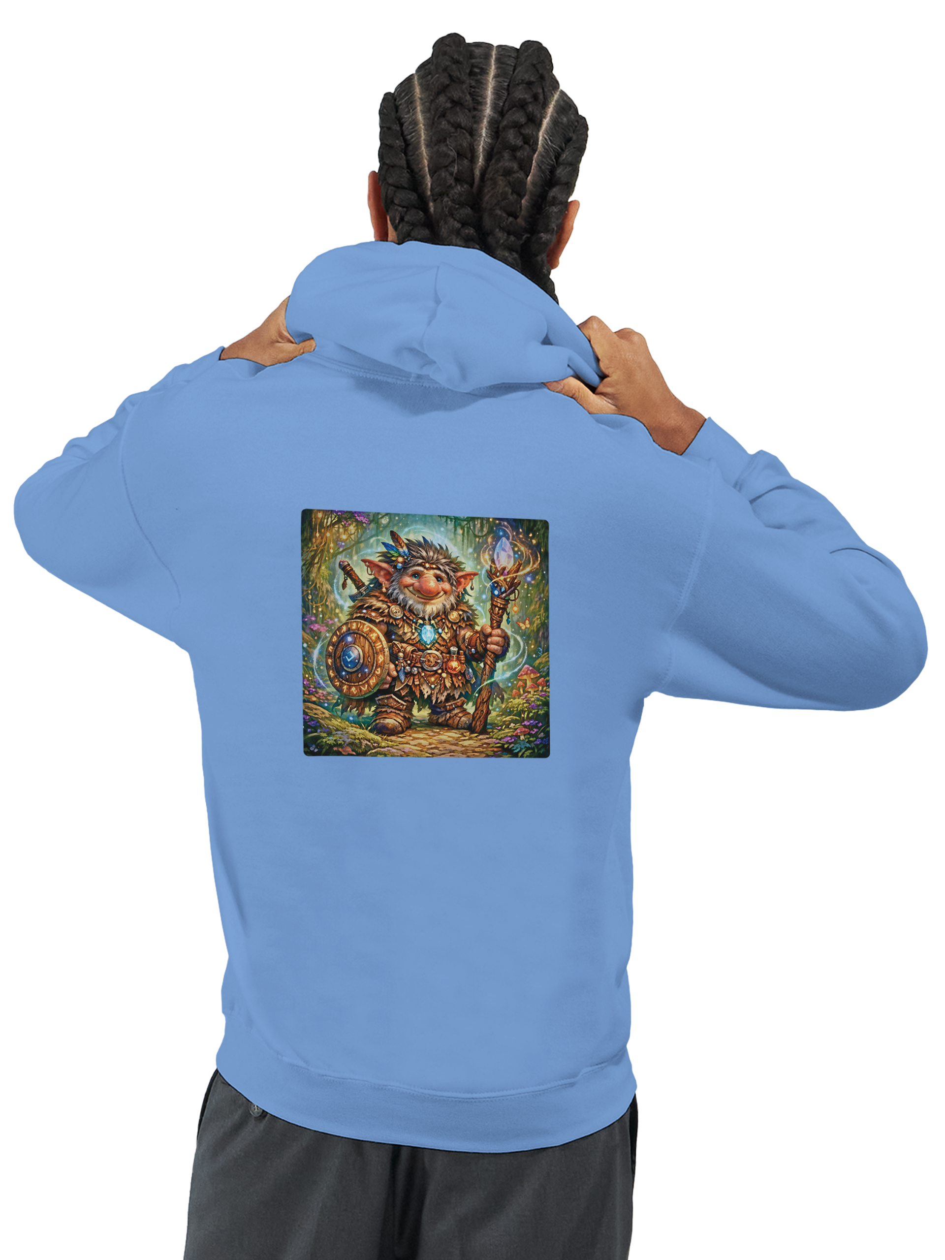 - Har en dubbelfodrad huva med matchande dragsko.